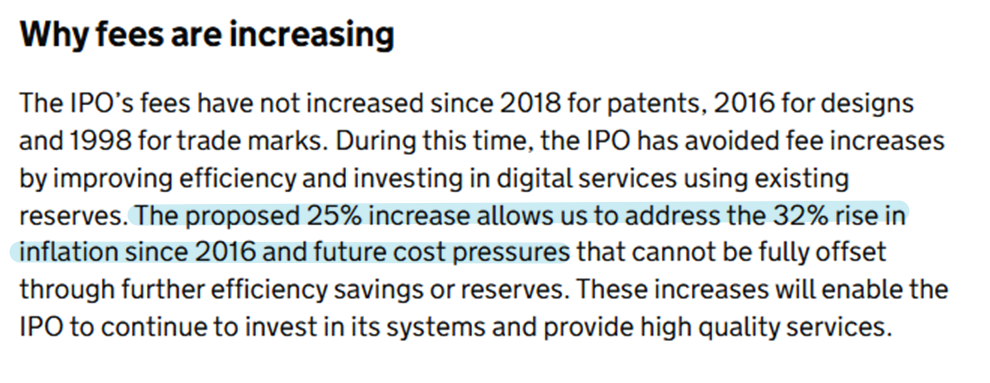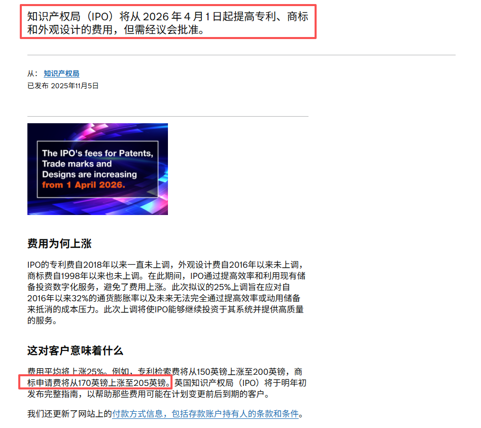 英国商标专利官费上涨详情 以下为2025年与2026年新旧费用对比(币种单位:英镑): ![]() 总结 ![]() 商标首类注册费从£170涨至£205,涨幅约21%;外观专利新注册从£50涨至£60,涨幅20%;部分续展及异议程序费上调幅度最高达25%;整体来看,英国知识产权注册成本将全面上升。 温馨提示 ![]() 以上所提到的费用信息均来源于英国知识产权局(IPO)官方网站,若后续政策有所调整,所有费用标准最终请以IPO官网发布的最新信息为准。 官费上涨的主要原因 ![]() 根据UK IPO公告,简而言之: ◆应对通胀压力:自2016年起,英国累计通胀32%,原有收费已难以覆盖成本。 ◆升级数字化服务:投入更多资源优化线上系统与审查流程。 ◆维持服务质量:涨价用于保障审查稳定与系统运行。